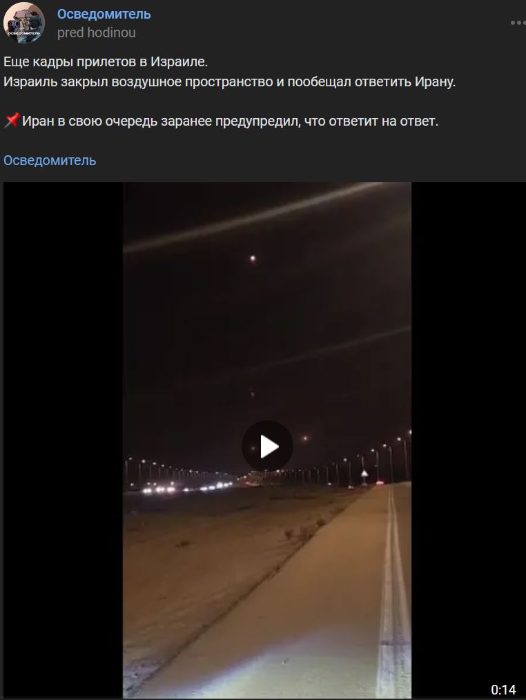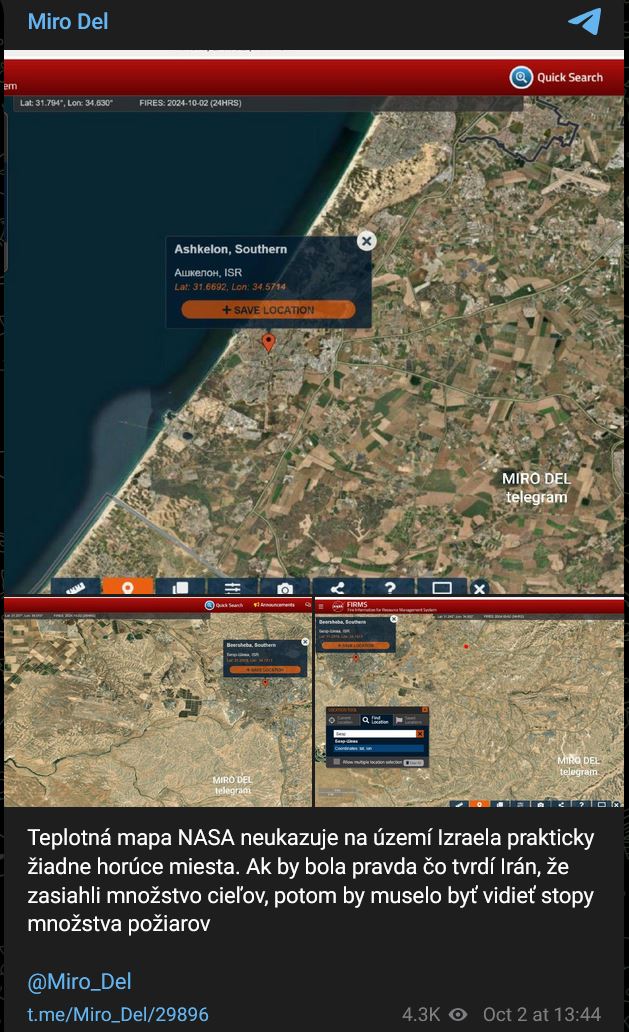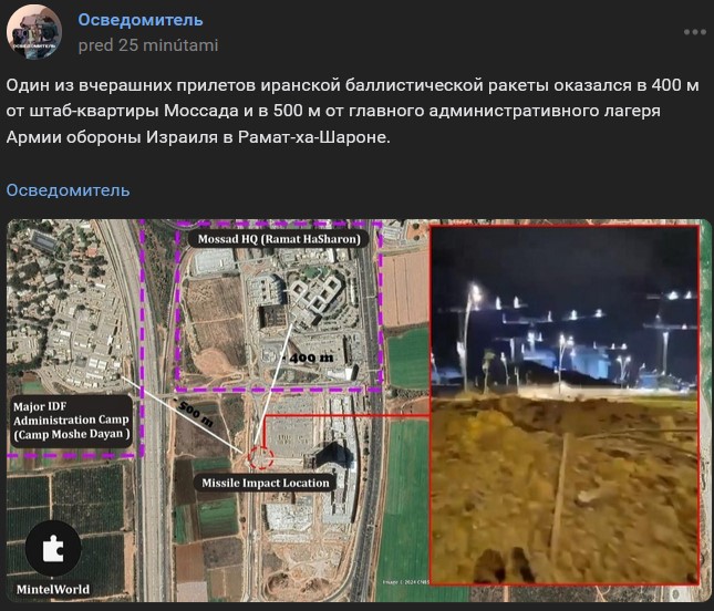Zdroj https://vk.com/wall-123538639_4337834 z 02.10.2024Jeden zo včerajších (utorok 01.10.2024) príletov iránskej balistickej rakety sa nachádzala 400 metrov od štábu / sídla Mossadu a 500 metrov od hlavného administratívneho tábora Izraelských obranných síl v Ramat ha-Šaron.