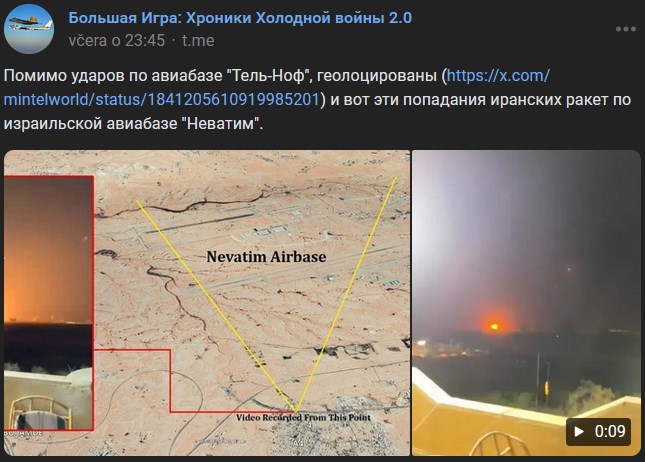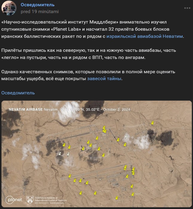 Zdroj https://vk.com/wall-104764077_538957 / https://t.me/ImpNavigator/8734 z 01.10.2024Okrem úderov na leteckú základňu Tel Nof sú tieto iránske raketové zásahy na izraelskú leteckú základňu Nevatim geolokalizované.