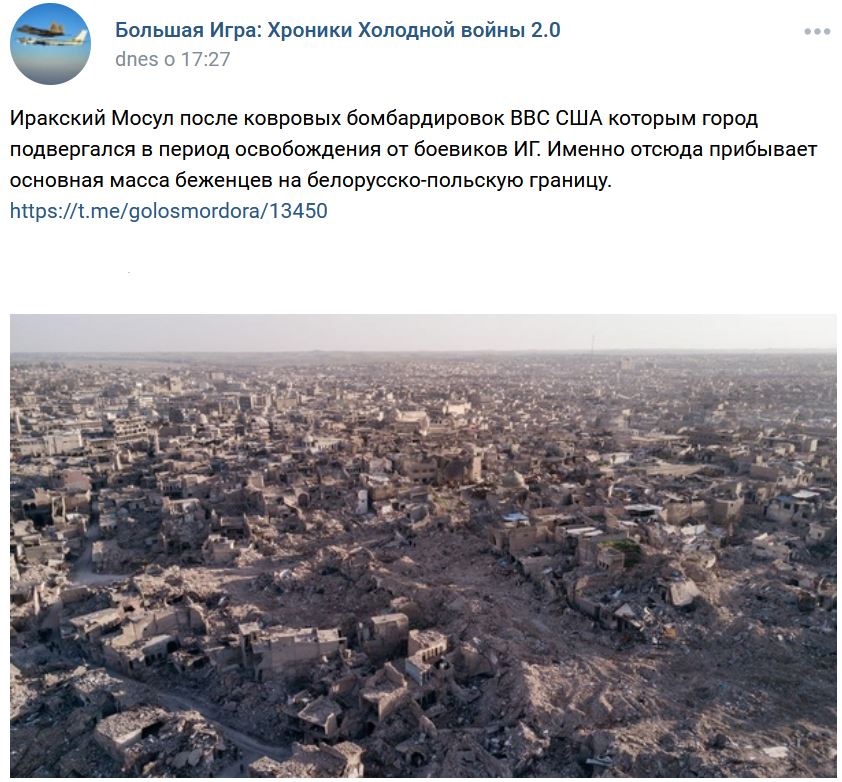 Иракский Мосул после ковровых бомбардировок ВВС США которым город подвергался в период освобождения от боевиков ИГ. Именно отсюда прибывает основная масса беженцев на белорусско-польскую границу.