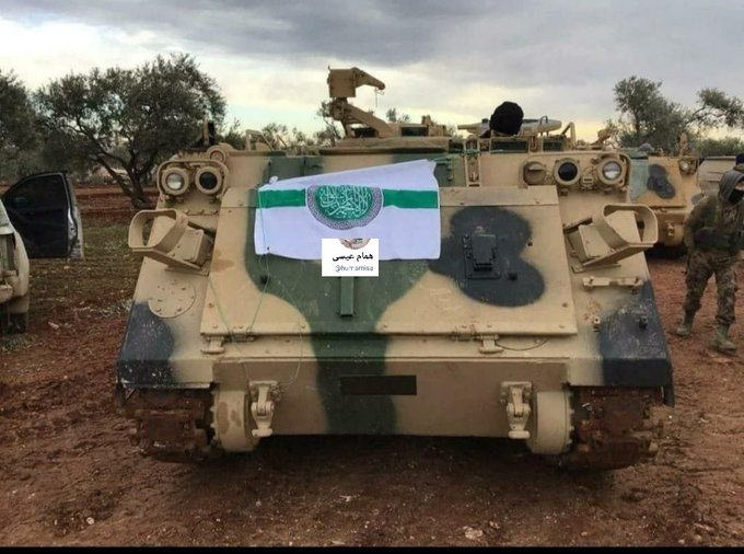 Idlib. Fotografie militantov "Hayat Tahrir al-Sham" (HTS) boli zverejnené na americkom obrnenom transportéri M113. HTS boli USA oficiálne uznané ako teroristická organizácia v roku 2018.