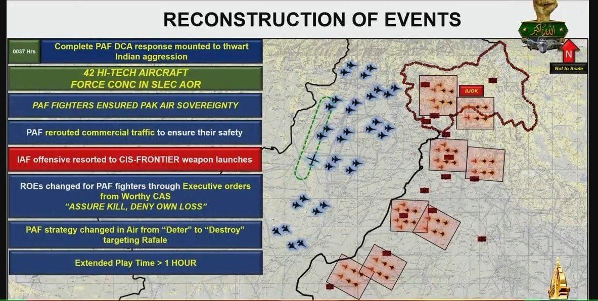 Oficiální infografika Pákistánského letectva zobrazující kde, a jaký indický letoun byl v noci na 07.05.2025 sestřelen