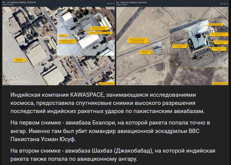 Indická spoločnosť KAWASPACE, ktorá sa zaoberá výskumom vesmíru, poskytla satelitné snímky s vysokým rozlíšením následkov indických raketových útokov na pakistanské letecké základne. Na prvej snímke je letecká základňa Bhalori, kde raketa presne zasiahla hangár. Práve tam zahynul Usman Júsuf, veliteľ leteckej eskadry VVS Pakistanu. Na druhom obrázku je letecká základňa Shahbaz (Jacobabad), kde indická raketa tiež zasiahla letecký hangár.