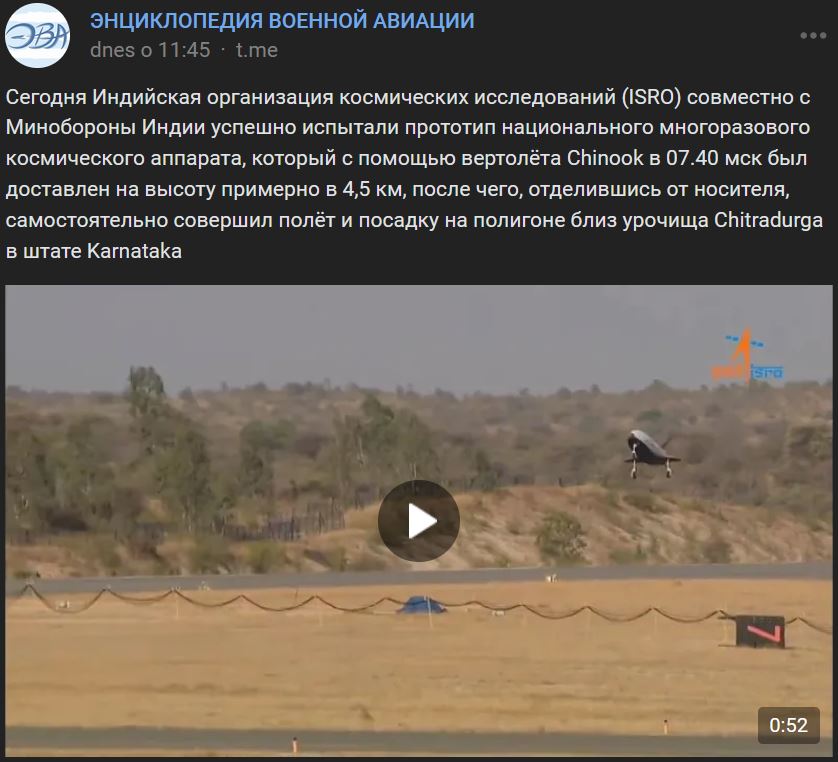 V nedeľu 02.04.2023 Indická organizácia pre vesmírny výskum (ISRO) a Ministerstvo obrany Indie úspešne otestovali prototyp národnej viacnásobne použiteľnej kozmickej lode, ktorú o 07:40 hod. MSK vyniesol vrtuľník Chinook do výšky približne 4,5 km, potom sa oddelila od nosiča a samostatne letela a pristála na polygóne Chitradurga v štáte Karnataka