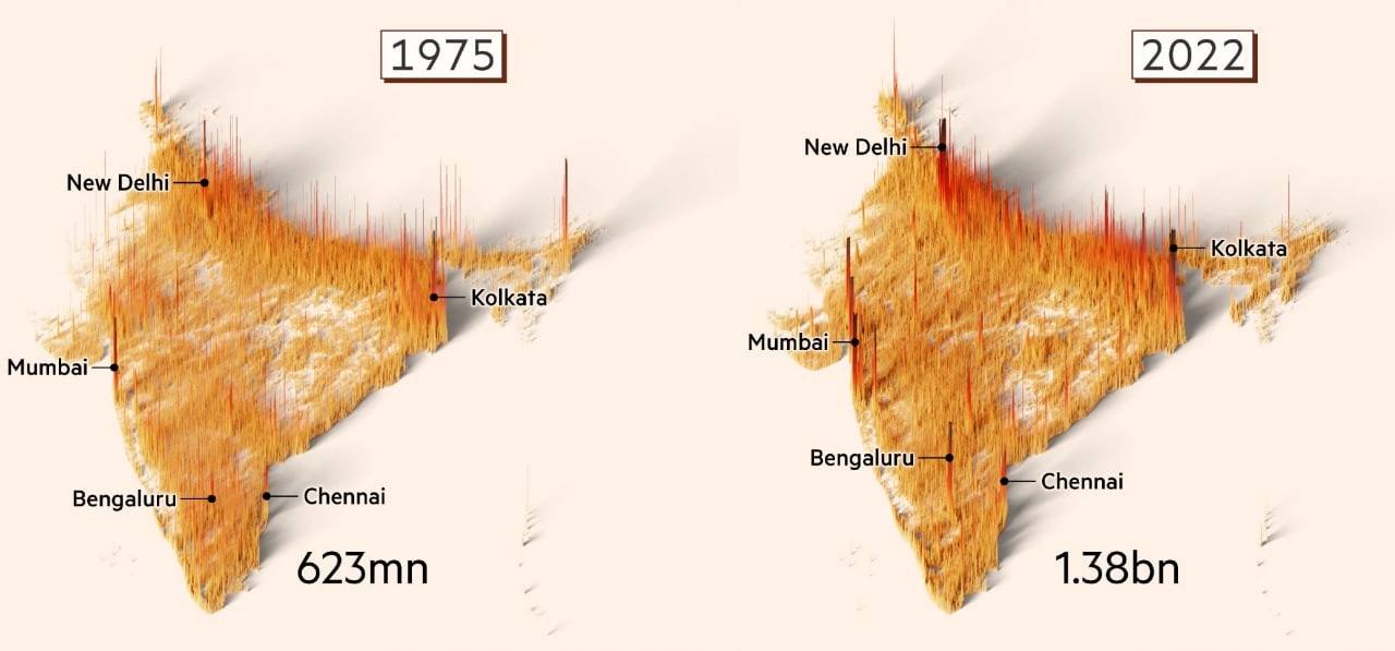 Jak se změnila hustota zalidnění v Indii za posledních zhruba 50 let