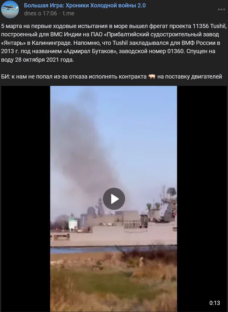V utorok 05.03.2024 sa na prvé námorné skúšky na more vydala fregata "Tushil" projektu 11356 postavená pre VMS Indie v PAO "Pribaltijskij sudostroiteľnyj zavod Jantar" (Прибалтийский судостроительный завод Янтарь) v Kaliningrade. Pripomeňme, že frgata "Tushil" bola pôvodne založená pre VMF Ruska v roku 2013 pod názvom "Admiral Butakov" (Адмирал Бутаков), továrenské číslo 01360. Na vodu bola spustená 28.10.2021.