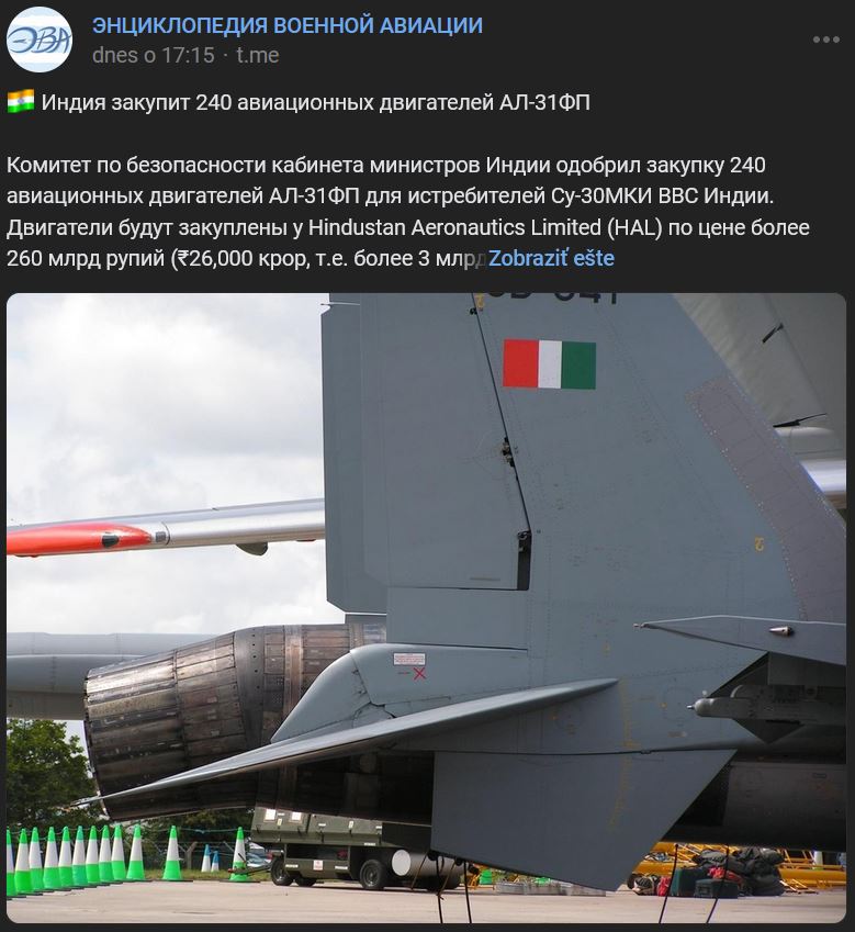 „Su-30MKI (Су-30МКИ) je jedným z najvýkonnejších a strategicky najdôležitejších lietadiel indického letectva. Dodávka týchto leteckých motorov spoločnosťou HAL splní požiadavky indických vzdušných síl na udržiavanie letectva, aby mohlo pokračovať v nepretržitej prevádzke a posilniť obranyschopnosť krajiny,“ uviedol indický kabinet v oficiálnom vyhlásení. Zdroj https://vk.com/wall-173678697_386829 / https://t.me/AviaCT/27644 z 03.09.2024
