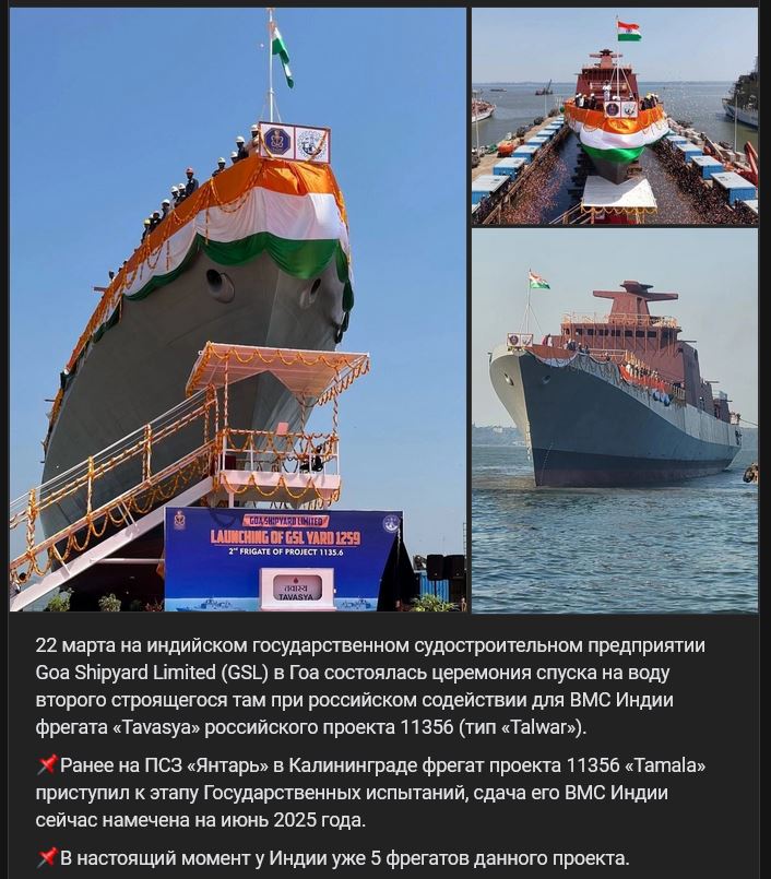 Zdroj https://vk.com/wall-123538639_4524235 z 25.03.2025V sobotu 22.03.2025 sa v indickom štátnom lodiarskom podniku Goa Shipyard Limited (GSL) v Goa uskutočnilo slávnostné spustenie na vodu 2. fregaty „Tavasya“ ruského projektu 11356 (typ Talwar), ktorá sa tam s ruskou pomocou stavia pre VMS Indie. Predtým sa v lodeniciach PSZ Jantar (ПСЗ Янтарь) v Kaliningrade pre fregatu projektu 11356 Tamala začala fáza štátnych skúšok, ktorej dodanie indickému námorníctvu je teraz naplánované na 06/2025. V súčasnosti má India už 5 fregát tohto projektu.