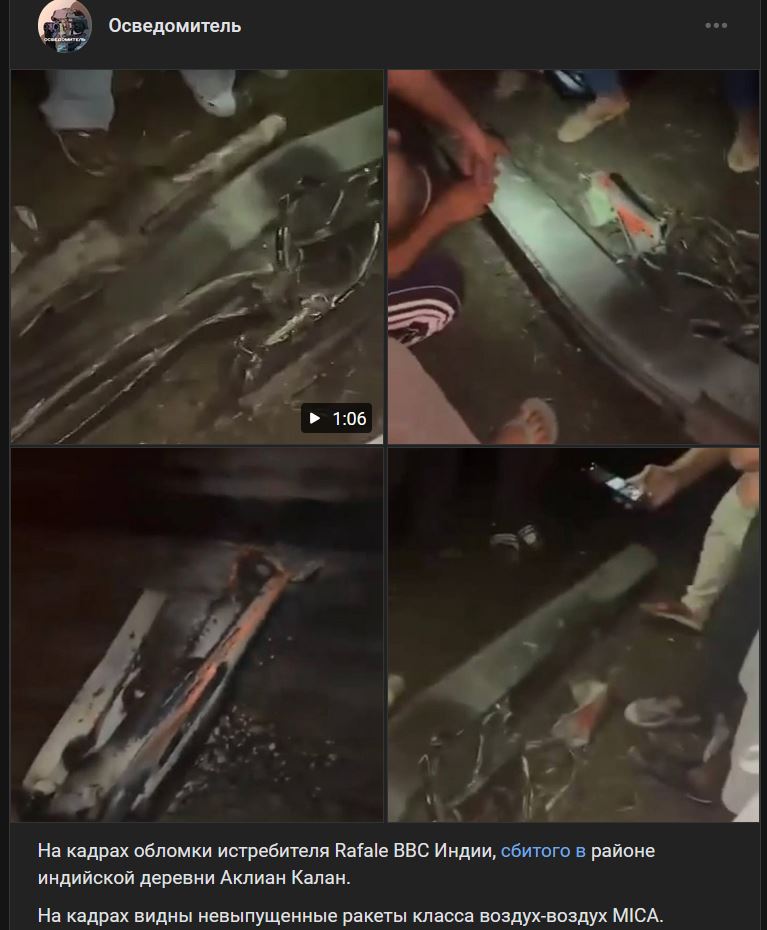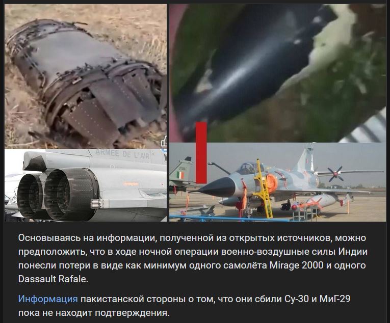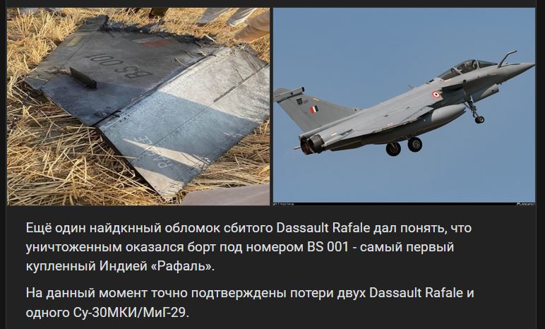 Ešte ďalšie nájdené trosky zostreleného lietadla Dassault Rafale jasne ukázali, že zničené lietadlo malo registráciu BS 001, úplne prvé lietadlo Rafale, ktoré India kúpila. Doteraz boli potvrdené straty 2 lietadiel Dassault Rafale a jedného Su-30MKI/MiG-29. Zdroj https://vk.com/wall-123538639_4566322 z 07.05.2025