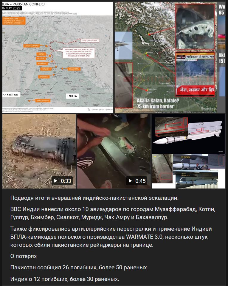 https://t.me/voenkorKotenok/64054Pákistán tvrdí, že při indických úderech v Kašmíru zahynulo 24 civilistů. Indie tvrdí, že bylo zabito nejméně 17 teroristů. Zároveň Dillí hlásí také asi 10 mrtvých v důsledku odvetných pákistánských úderů, rovněž na Kašmír, ale již indických.