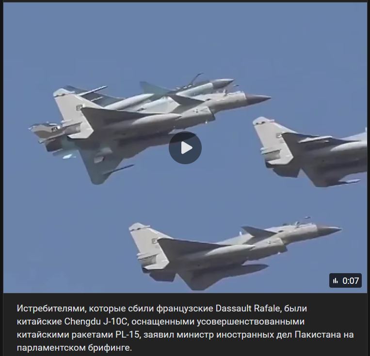Lietadlá, ktoré zostrelili francúzske Dassault Rafale, boli čínske lietadlá Chengdu J-10C vybavené modernými čínskymi raketami PL-15, uviedol pakistanský minister zahraničných vecí na brífingu v parlamente. Video https://vk.com/video-123538639_456316240 dĺžka 7 sek.