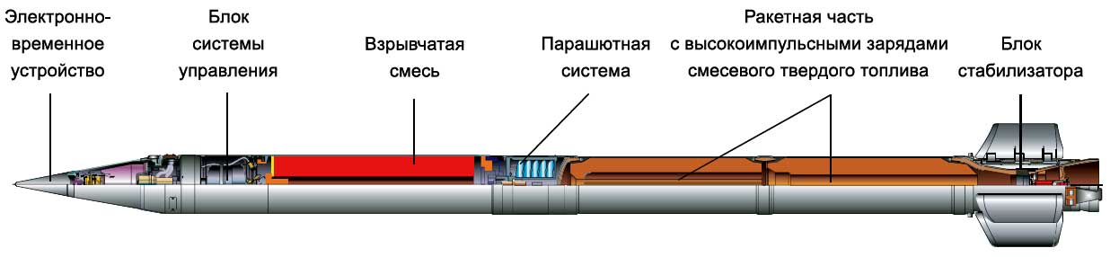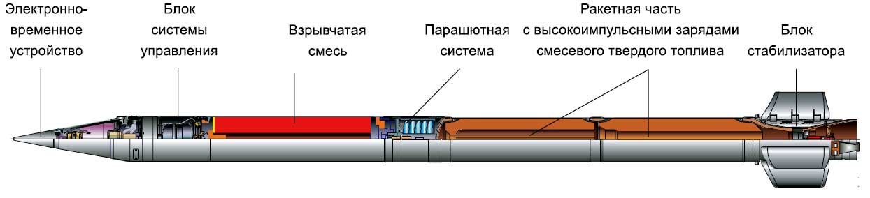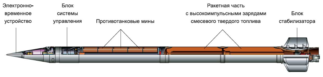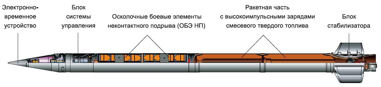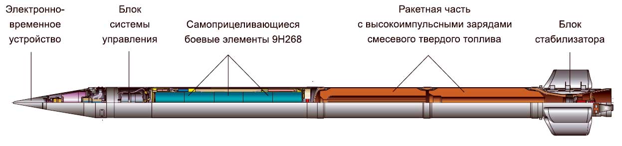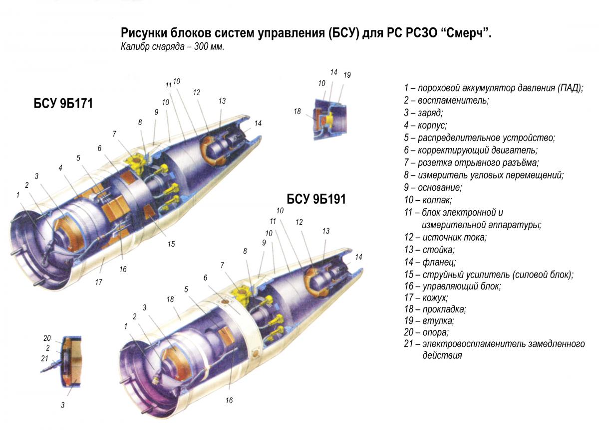 "Raketové střely vyvinuté pro Smerch MLRS mají unikátní konstrukci, která poskytuje přesnost zásahu, která je 2-3krát vyšší než u podobných zahraničních raketových dělostřeleckých systémů. Poprvé byly sovětské raketové dělostřelecké granáty řiditelné. Při jejich návrhu byl použit inerciální řídicí systém, který zajišťuje úhlovou stabilizaci střel v aktivní části trajektorie a korekci dostřelu v důsledku korekce na dobu separace bojové hlavice, určenou palubním zařízením v souladu s naměřeným parametry pohybu střely."Разработанные для РСЗО "Смерч" реактивные снаряды имеют уникальную конструкцию, обеспечивающую точность попадания, в 2-3 раза превышающую аналогичный показатель зарубежных систем реактивной артиллерии. Впервые снаряды советской реактивной артиллерии стали корректируемыми. В их конструкции была применена инерциальная система управления, обеспечивающая угловую стабилизацию снарядов на активном участке траектории и коррекцию дальности за счет поправки к времени отделения головной части, определяемой бортовой аппаратурой в соответствии с измеряемыми параметрами движения снаряда.
