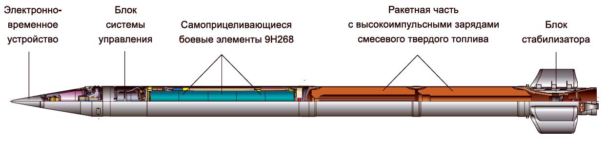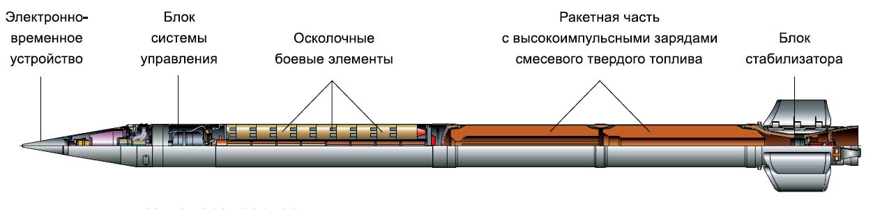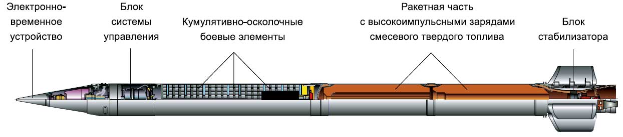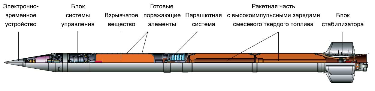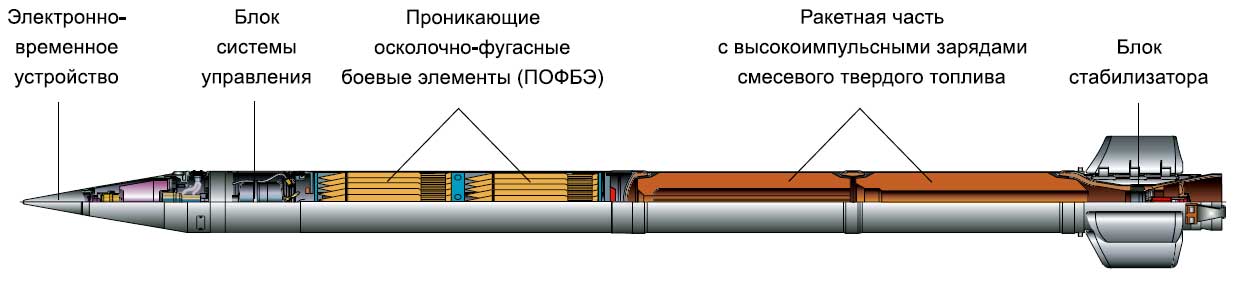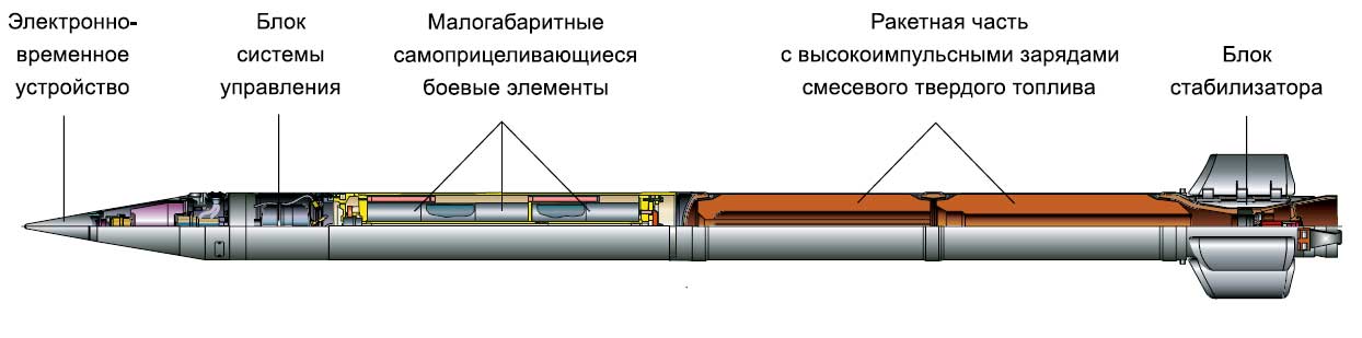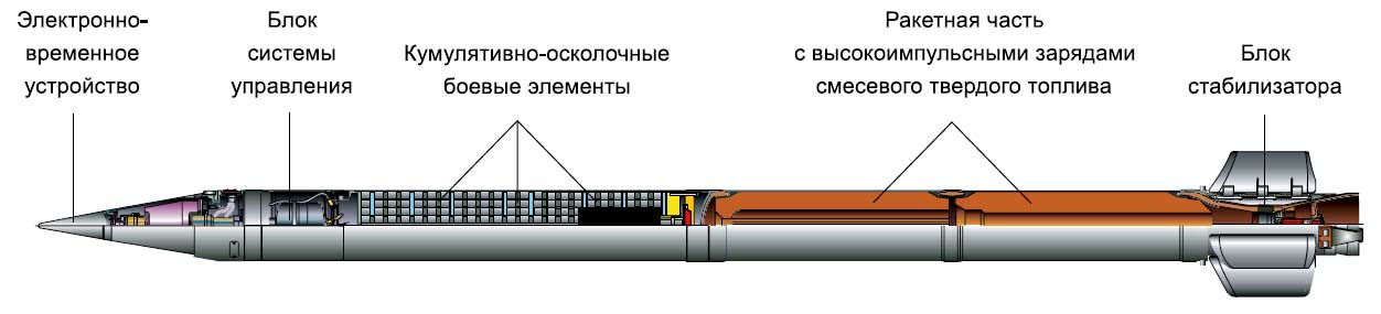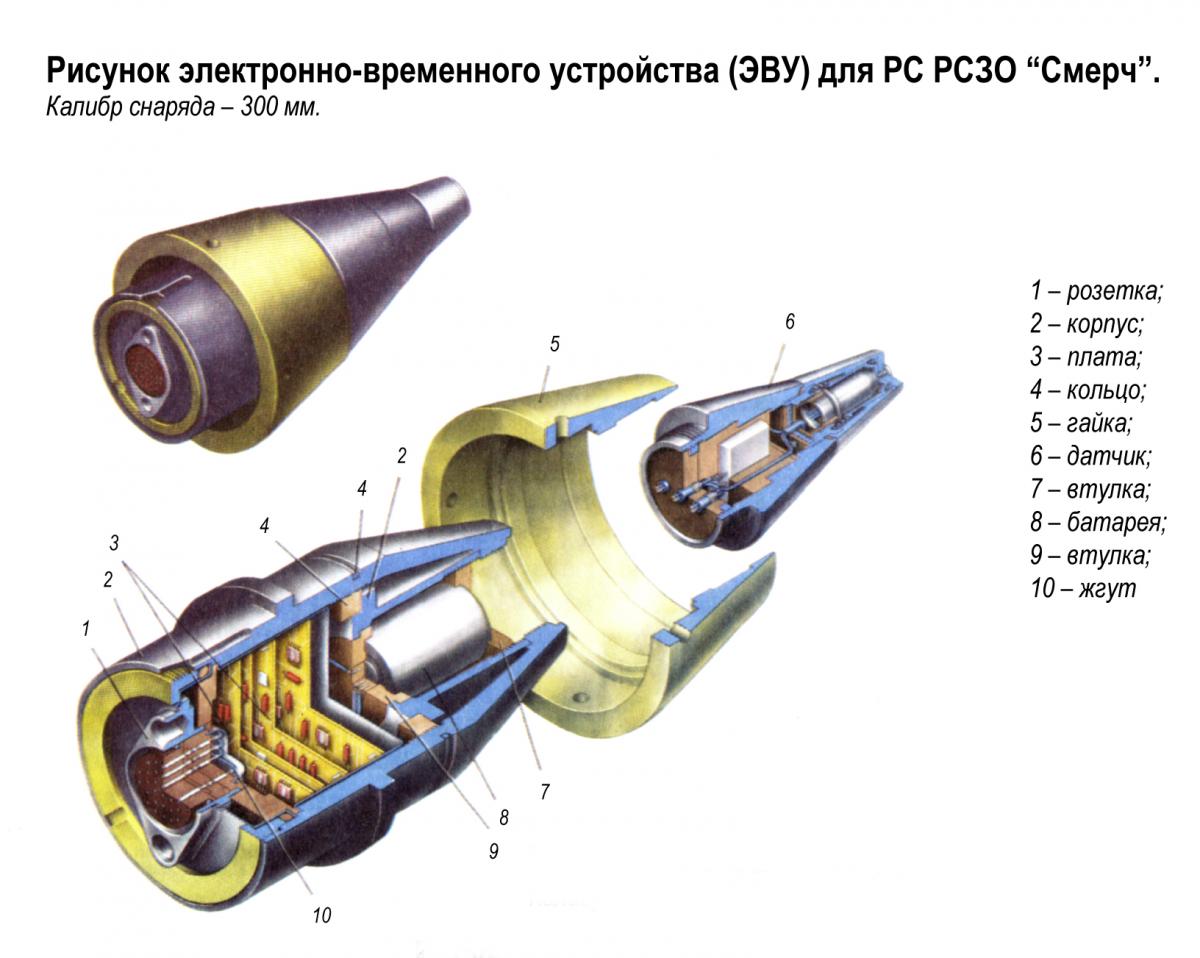 "Raketové střely vyvinuté pro Smerch MLRS mají unikátní konstrukci, která poskytuje přesnost zásahu, která je 2-3krát vyšší než u podobných zahraničních raketových dělostřeleckých systémů. Poprvé byly sovětské raketové dělostřelecké granáty řiditelné. Při jejich návrhu byl použit inerciální řídicí systém, který zajišťuje úhlovou stabilizaci střel v aktivní části trajektorie a korekci dostřelu v důsledku korekce na dobu separace bojové hlavice, určenou palubním zařízením v souladu s naměřeným parametry pohybu střely."Разработанные для РСЗО "Смерч" реактивные снаряды имеют уникальную конструкцию, обеспечивающую точность попадания, в 2-3 раза превышающую аналогичный показатель зарубежных систем реактивной артиллерии. Впервые снаряды советской реактивной артиллерии стали корректируемыми. В их конструкции была применена инерциальная система управления, обеспечивающая угловую стабилизацию снарядов на активном участке траектории и коррекцию дальности за счет поправки к времени отделения головной части, определяемой бортовой аппаратурой в соответствии с измеряемыми параметрами движения снаряда.