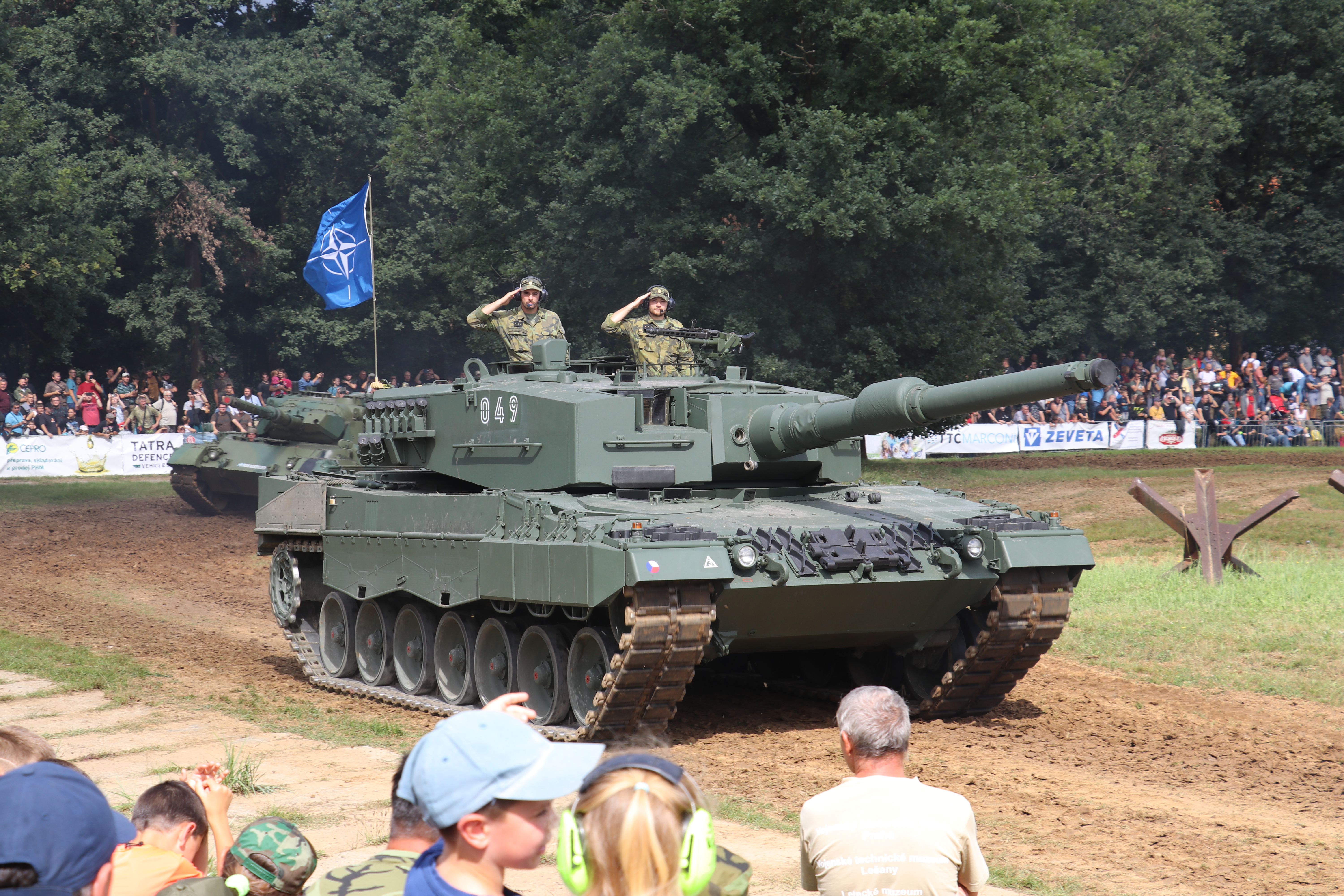 ..Leoprd se zmohl na pomalé objíždění areálu po ujeté trase, vlajku NATO a permanentní salutování posádky (mimochodem,nemají náhodou posádky Leoprdů mít helmy?)...