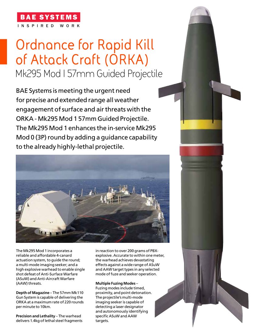 Idea s ORKA bylo začlenit přesné navádění do projektilu o průměru 57mm, aby jej bylo možné použít k obraně lodí námořnictva před hrozbou roje malých lodí, kterou typicky představují země jako Írán, uvedl Chris King, ředitel rozvoje obchodu pro pozemní a zbrojní oblast BAE.