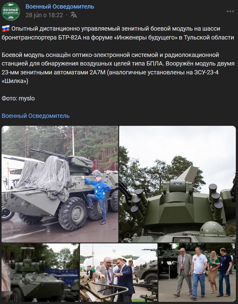 Experimentálny diaľkovo ovládaný protilietadlový bojový modul na podvozku obrneného transportéra BTR-82A (БТР-82А) na fóre "Inžinieri budúcnosti" (Инженеры будущего) v Tulskej oblasti. Bojový modul je vybavený opto-elektronickým systémom a radarovou stanicou na zisťovanie vzdušných cieľov, napríklad bezpilotných lietadiel (BPLA). Modul je vyzbrojený dvoma 23 mm protilietadlovými kanónmi 2A7M (podobnými tým, ktoré sú nainštalované na ZSU-23-4 Šilka / ЗСУ-23-4 Шилка).