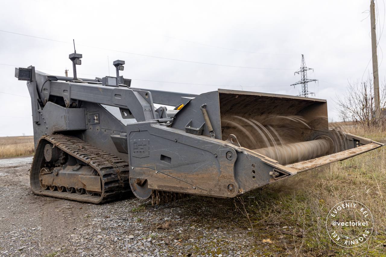 Ruský diaľkovo ovládaný robotický odmínovací komplex "DST-Ural" počas odmínovania územia DNR.