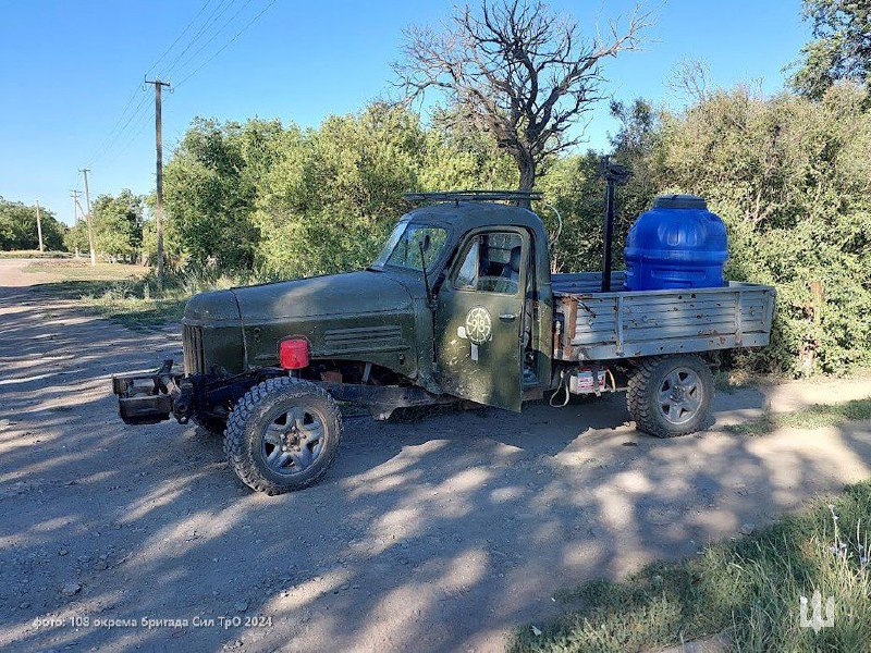 Ukrajinská technika, zmontovaná z toho, čo bolo v službe 108. samostatnej brigády územnej obrany. Rám a nápravy z obrneného vozidla "Kozak-2M",