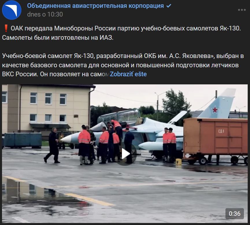 OAK odovzdala Ministerstvu obrany Ruska dávku cvične-bojového lietadla Jakovlev Jak-130 (Як-130). Lietadlá boli vyrobené v ИАЗ. Cvične-bojové lietadlo Jak-130, vyvinuté Jakovlevskou konštrukčnou kanceláriou, bolo vybrané ako základné lietadlo pre základný a pokročilý výcvik pilotov ruských leteckých síl (VKS). Umožňuje trénovať pilotov bojových lietadiel generácie 4+ aj 5 na najmodernejšej úrovni. Lietadlo Jak-130 je hlavnou súčasťou výcvikového komplexu, ktorý zahŕňa integrovaný systém objektívneho riadenia, kurzy počítačového výcviku, akrobatické a špecializované simulátory. Irkutský AviaZavod (Иркутский авиазавод = ИАЗ) plní svoje povinnosti podľa štátneho obranného poriadku. Letecké vybavenie sa vyrába v súlade s harmonogramom. Vo výrobe sú lietadlá nasledujúcich šarží, ktorých dodávka je naplánovaná na tento rok 2023, " uviedol Jurij Sljusar (Юрий Слюсарь), generálny riaditeľ OAK.