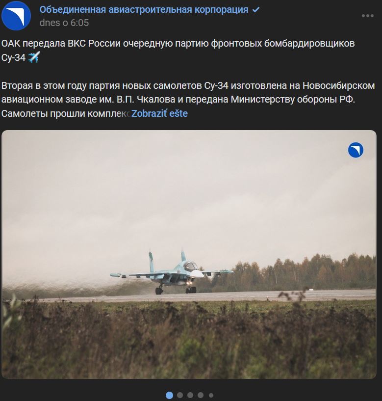"OAK (ОАК) dodáva lietadlá v rámci programu na tento rok 2023. Nedávno bol VTA (ВТА) odovzdaný ďalší IL-76MD-90A (viď1 viď2 ). Séria lietadiel Su-34 je prvou tohtoročnou dodávkou operačno-taktických lietadiel. OAK, ktorý je súčasťou spoločnosti Rostech, má najdôležitejšiu úlohu - dodať ruskému ministerstvu obrany nové vysokovýkonné lietadlá," povedal generálny riaditeľ OAK Jurij Sljusar (Юрий Слюсарь). Svoje záväzky vyplývajúce zo štátnej objednávky v oblasti obrany plníme včas a spolu s armádou vykonávame potrebné práce na udržanie lietadiel v prevádzke."