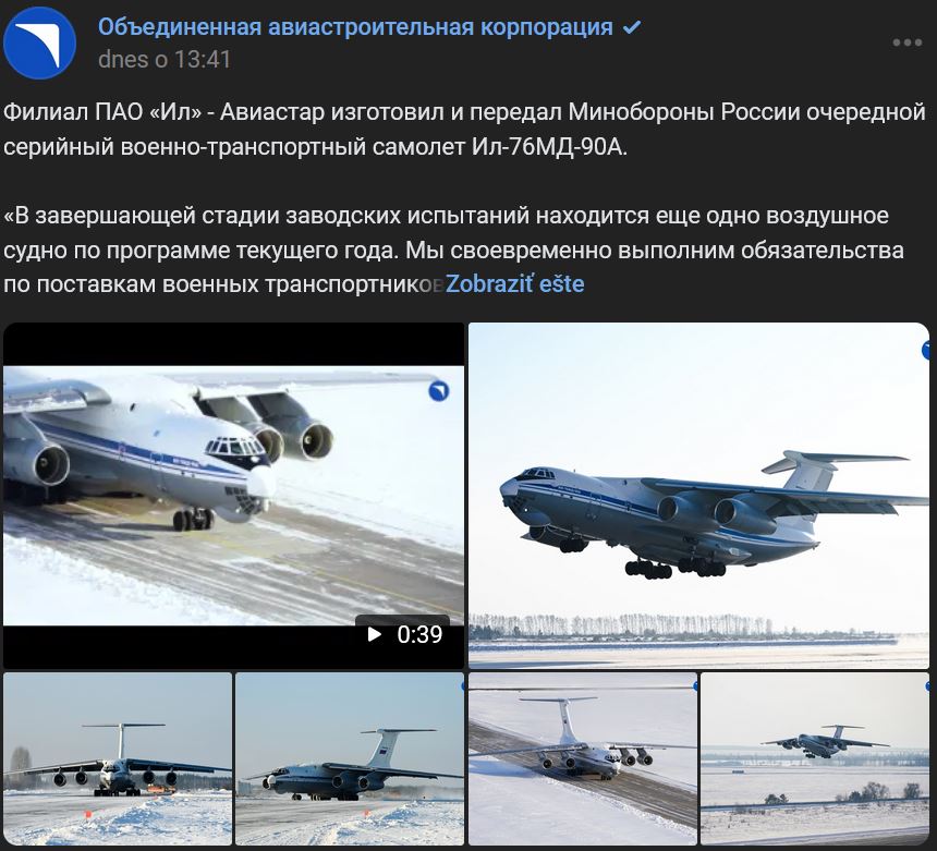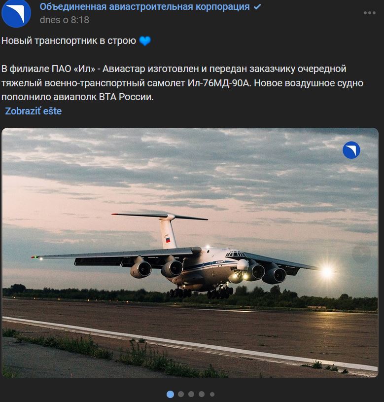Pobočka PAO Il (ПАО Ил) - Aviastar (Авиастар) vyrobila a odovzdala ruskému ministerstvu obrany ďalšie sériové vojenské dopravné lietadlo Iľjušin Il-76MD-90A (Ил-76МД-90А).