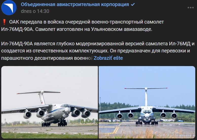 OAK odovzdala vojakom ďalšie vojenské dopravné lietadlo Iľjušin Il-76MD-90A (Ил-76МД-90А). Lietadlo bolo vyrobené v Uľjanovskom leteckom závode. Lietadlo IL-76MD-90A je hlboko modernizovanou verziou lietadla IL-76MD (Ил-76МД) a je vyrobené z domácich komponentov. Je určené na prepravu a výsadok vojenského vybavenia, personálu a nákladu.