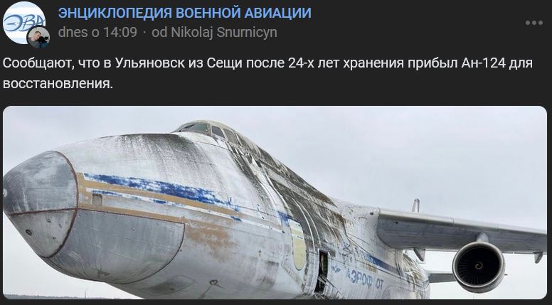 Uvádza sa, že do Uljanovska (Ульяновс) z letiska Sešča (Сеща) po 24 rokoch skladovania pod nebom dorazil Antonov An-124 na obnovu / generálnu opravu.