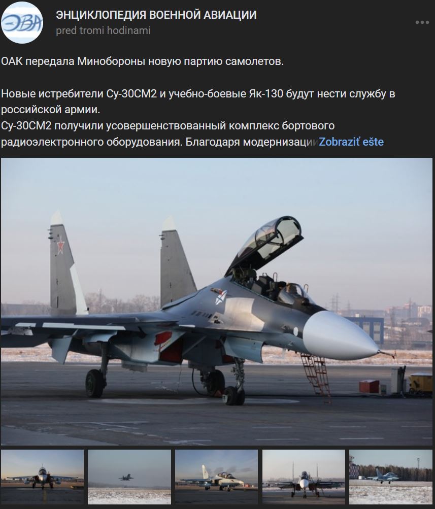 Nové lietadlá Suchoj Su-30SM2 (Су-30СМ2) a cvičné lietadlá Jakovlev Jak-130 (Як-130) budú slúžiť v ruskej armáde. Video 30 https://vk.com/video-104764077_456270521 / https://t.me/rostecru/5021 dĺžka 1:03 min.