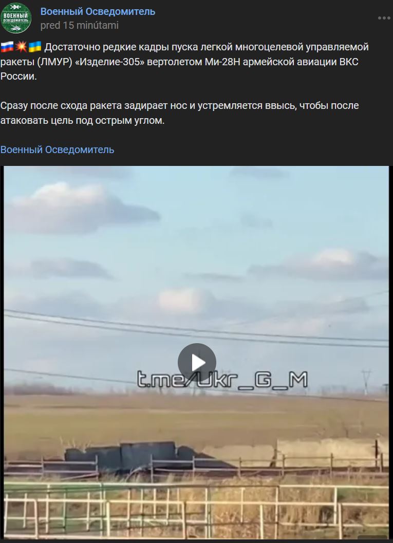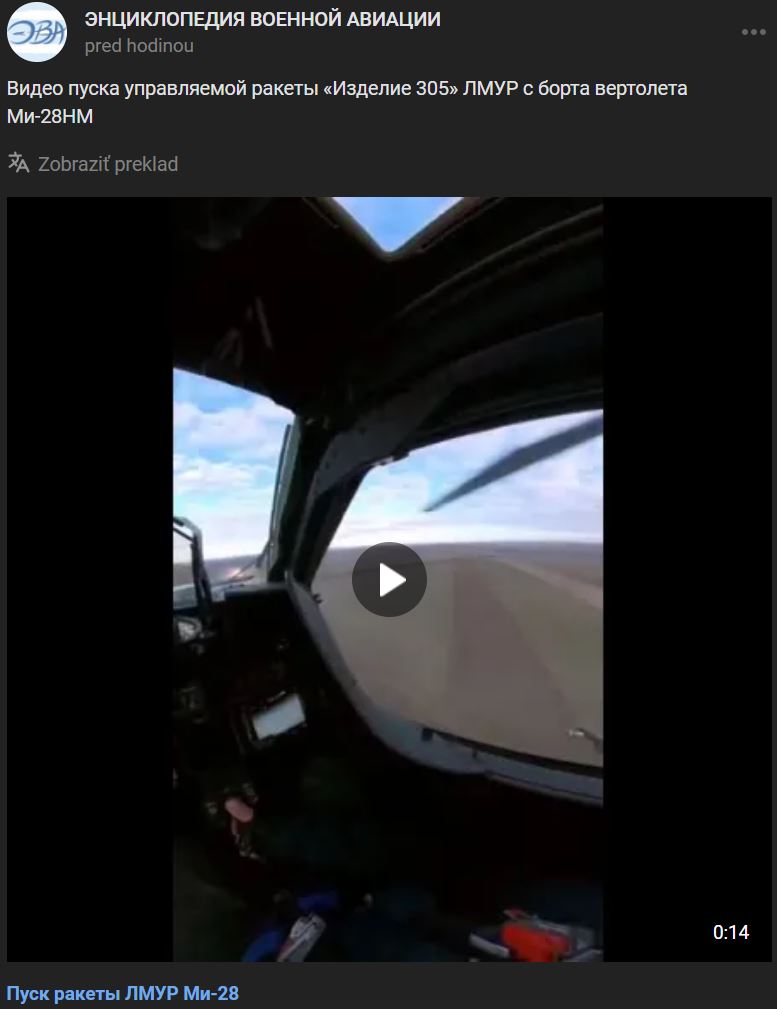 Pomerne vzácne zábery z odpálenia ľahkej viacúčelovej riadenej rakety (LMUR/ЛМУР) Izdelije-305 (Изделие-305) vrtuľníkom Mi-28N (Ми-28Н) vojenského letectva VKS Ruska. Ihneď po odpálení raketa zdvihne nos a rúti sa hore, aby zaútočila na cieľ pod ostrým uhlom.