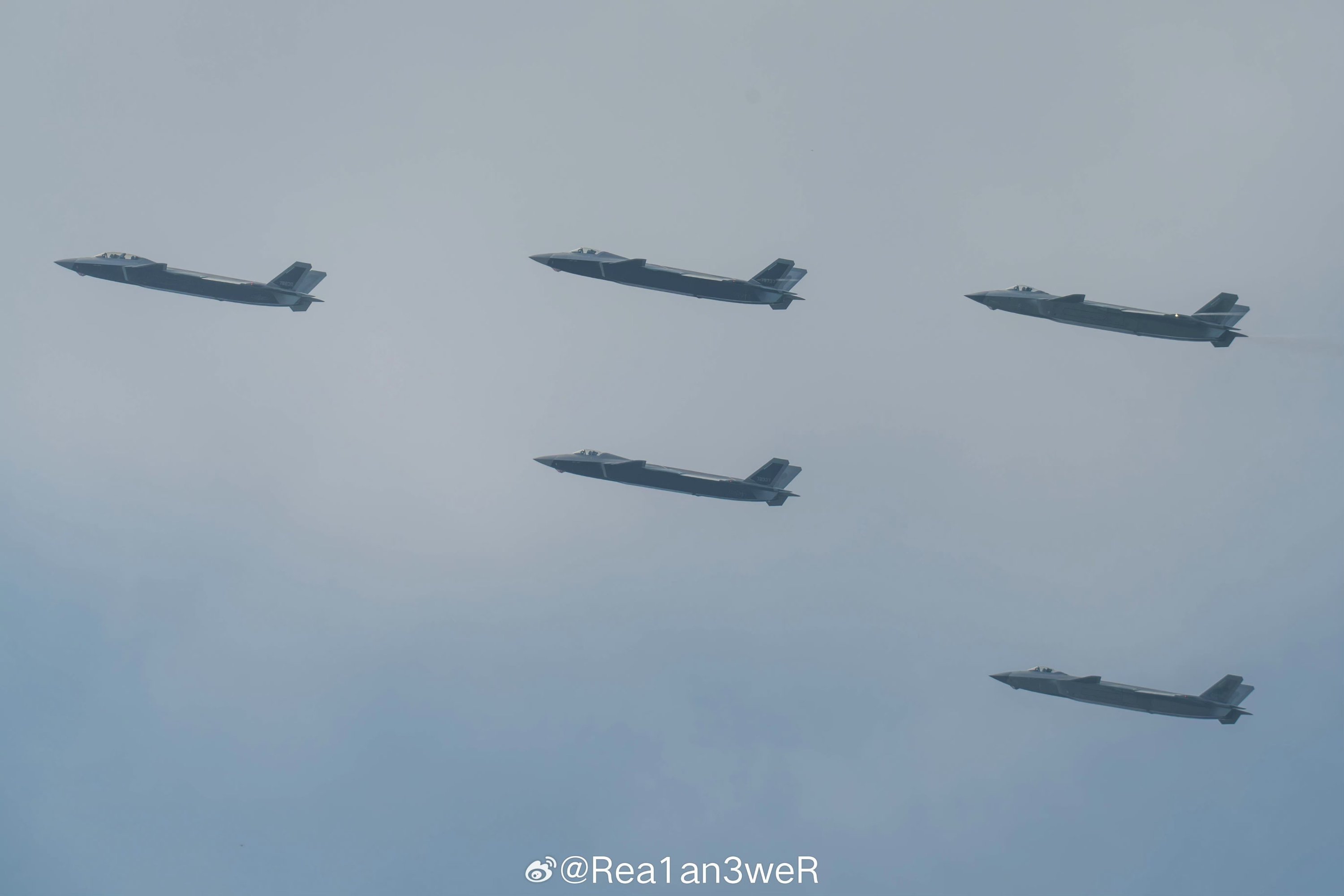 dva prototypy palubní verze J-35. Malosériová vyroba se ale již také rozběhla, takže je možné, že do zářijové přehlídky budou prototypy nahrazeny sériovými letouny. Součástí skupiny byly také nejpokročilejší čínské flankery J-15T (T=katapult), jimiž námořní letectvo už určitý čas nahrazuje postarší J-15A.