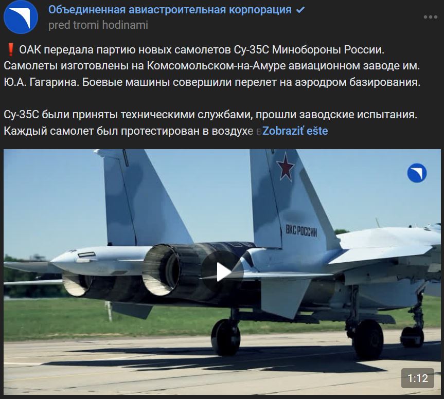 "Podniky OAK plniace štátnu obrannú objednávku, vrátane závodu v Komsomoľsku, získali vďaka štátnej podpore značný objem finančných prostriedkov v rámci programu technického dovybavenia a modernizácie výroby. Do prevádzky boli uvedené nové výrobné zariadenia a objekty. To nám umožňuje zvýšiť sériovú výrobu a zvýšiť objem produkcie," uviedol generálny riaditeľ OAK Jurij Sljusar (Юрий Слюсар). - Budeme pokračovať v plnení našich záväzkov vyplývajúcich z podpísaných zmlúv. Výroba ďalších sérií lietadiel Su-35 prebieha. Okrem toho v tomto roku 2023 zvýšime objem dodávok stíhačiek 5. generácie Su-57 (Су-57) pre VKS Ruska." Cenzúrované video s 2 lietadlami https://vk.com/video-211699782_456239118 dĺžka 1:12 min.