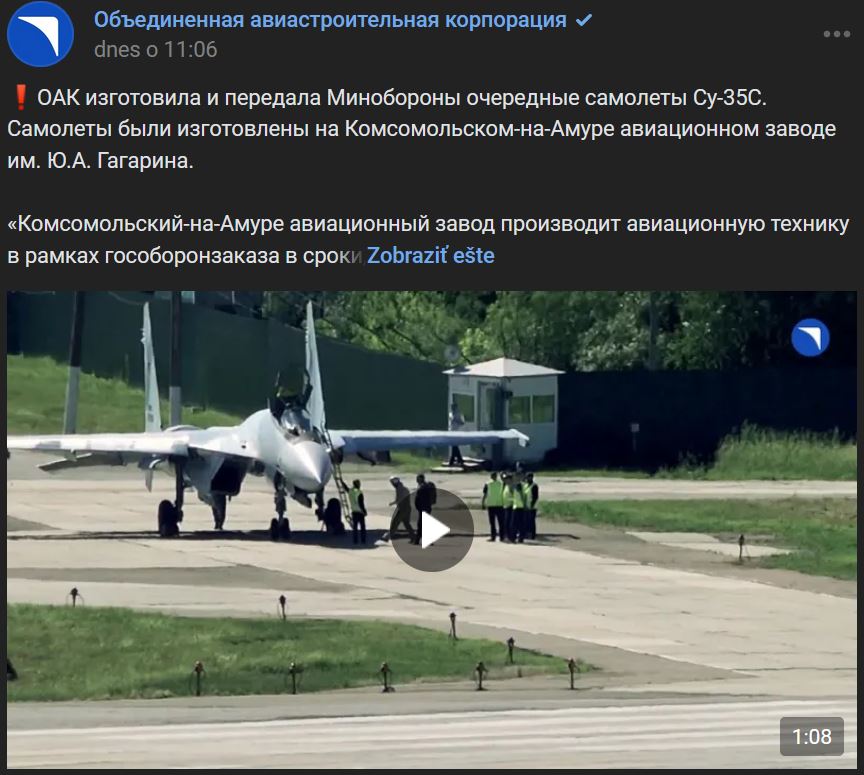 Spoločnosť OAK vyrobila a odovzdala Ministerstvu obrany Ruska ďalšie lietadlá Suchoj Su-35S (Су-35С). Lietadlá boli vyrobené v Komsomoľsku na Amure leteckom závode Ju. A. Gagarina. "Letecký závod v Komsomoľsku na Amure vyrába lietadlá v rámci štátnej obrannej objednávky v termínoch stanovených v zmluvách, vrátane predstihovania termínov dodávok, čím spĺňa potreby ruských VKS v oblasti moderných leteckých systémov," uviedol generálny riaditeľ OAK Jurij Sljusar (Юрий Слюсарь). Viacúčelové lietadlá Su-35S generácie 4++ absolvovali sériu pozemných a letových skúšok v rôznych prevádzkových režimoch a z letiska KnAAZ (КнААЗ) odleteli na miesto výkonu služby.