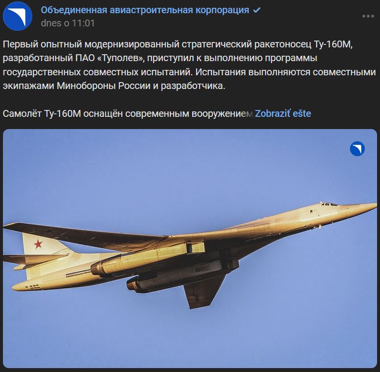 Prvý prototyp modernizovaného strategického raketového nosiča Tu-160M (Ту-160М) (po mojom Tu-160M1 = teda staro vyrobené teraz modernizované) vyvinutý spoločnosťou PAO Tupolev (ПАО Туполев) začal program spoločných štátnych skúšok. Skúšky vykonávajú spoločné posádky ruského ministerstva obrany a vývojára.