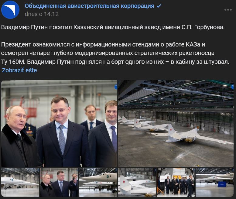Prezident sa oboznámil s informačnými stánkami o práci závodu a prezrel si 4 hlboko modernizované strategické raketové nosiče Tupolev Tu-160M (Ту-160М). Vladimir Putin vystúpal na palubu jedného z nich - v kokpite za kniplom ... Kazaňský letecký závod S. P. Gorbunova, pobočka spoločnosti AO Tupolev (súčasť PAO OAK, štátnej korporácie Rostech), je jedným z najväčších domácich podnikov na výrobu lietadiel, ktorý v roku 2023 zamestnával 8400 zamestnancov. Závod bol zmodernizovaný, obnovené boli unikátne výrobné a letové skúšobné zariadenia a opravená bola vzletová a pristávacia dráha. Konštrukčné centrum bolo vybavené modernou technológiou. Bol obnovený najväčší komplex na spracovanie titánových výrobkov na svete. V súčasnosti sa KAZ pripravujú na sériovú výrobu lietadiel Tupolev Tu-160M. Okrem toho plánuje zvýšiť výrobu osobných lietadiel Tupolev Tu-214. Zdroj https://vk.com/wall-211699782_16332 z 21.02.2024 + 8 foto