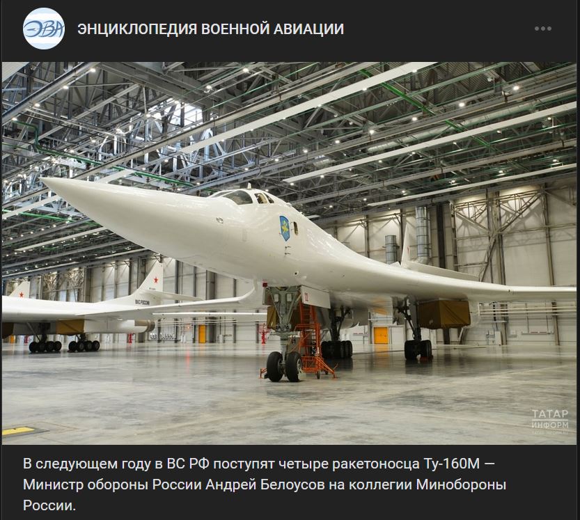 ↑ + V budúcom roku 2025 budú VS RF dodané 4 "raketonosce" Tupolev Tu-160M (Ту-160М) - povedal Minister obrany Ruska Andrej Belousov (Андрей Белоусов) na zasadnutí rady Ministerstva obrany Ruska.