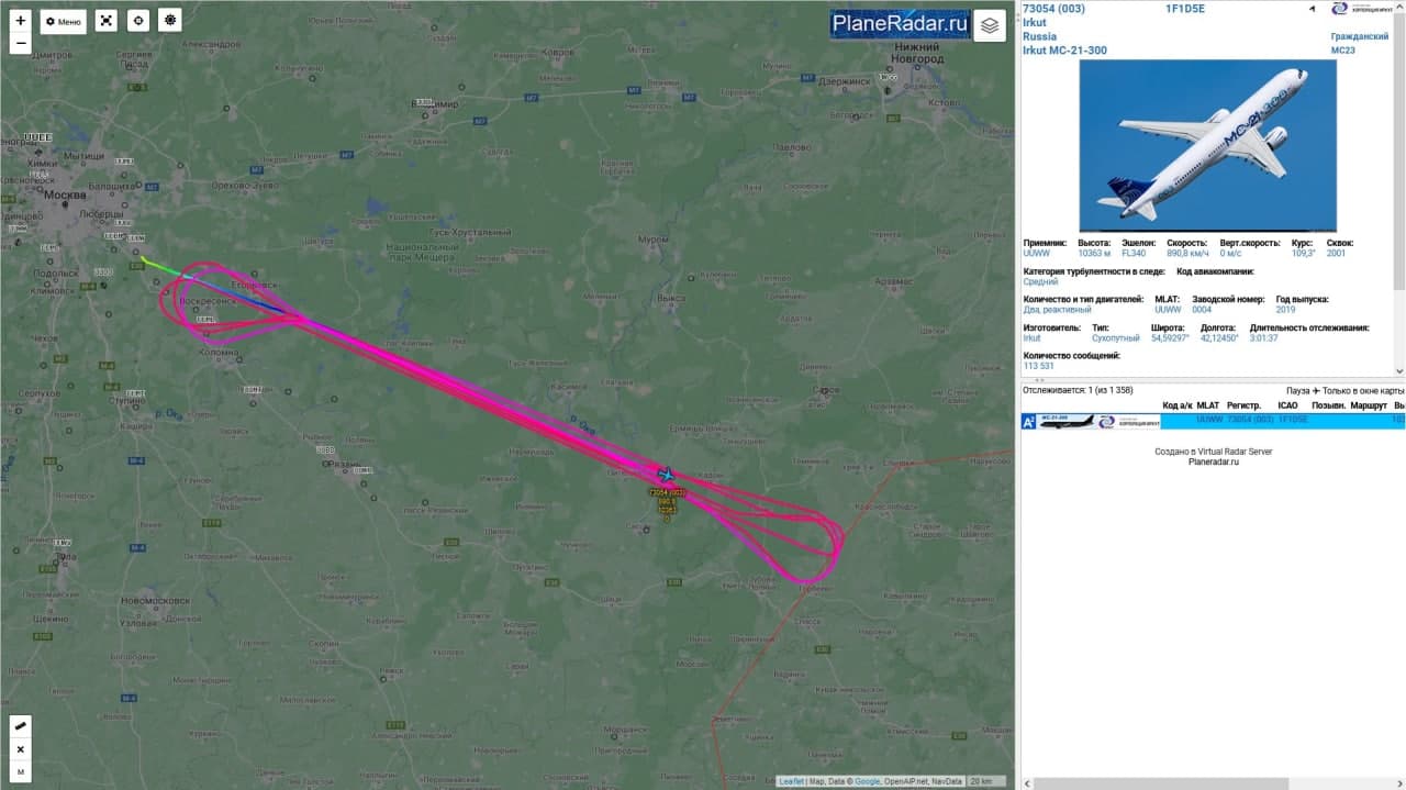 Irkut MC-21 s chvostom číslo 73054 (003), štartujúci z letiska Ramenskoye, vykonáva sériu testovacích letov.