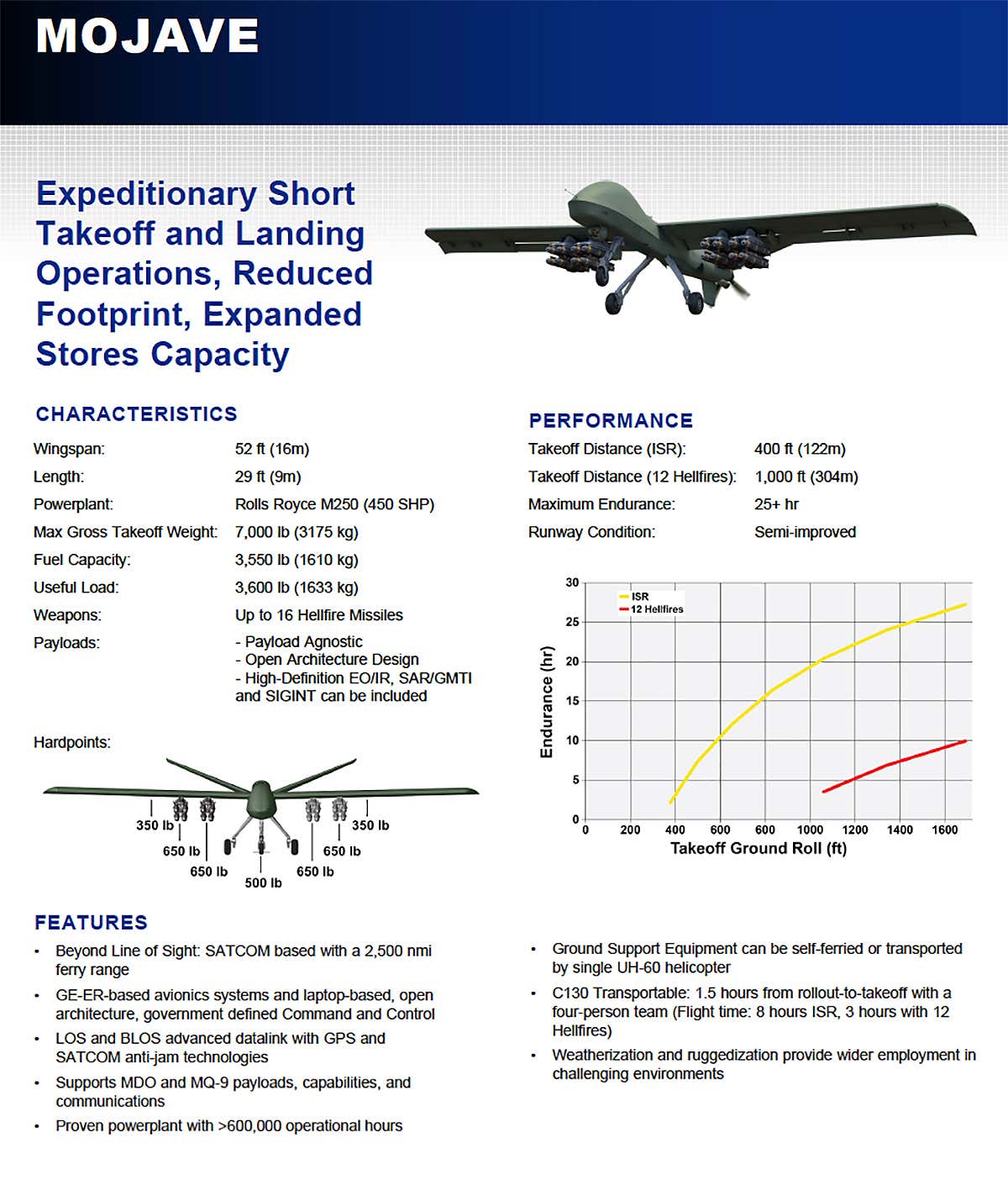 General Atomics Aeronautical Systems (GA-ASI) představila nový UAV s názvem „Mojave“ odvozený od MQ-1C Grey Eagle, optimalizovaný pro krátké vzlety a přistání z částečně vylepšených povrchů s kapacitou 16 střel Hellfire pod křídly.