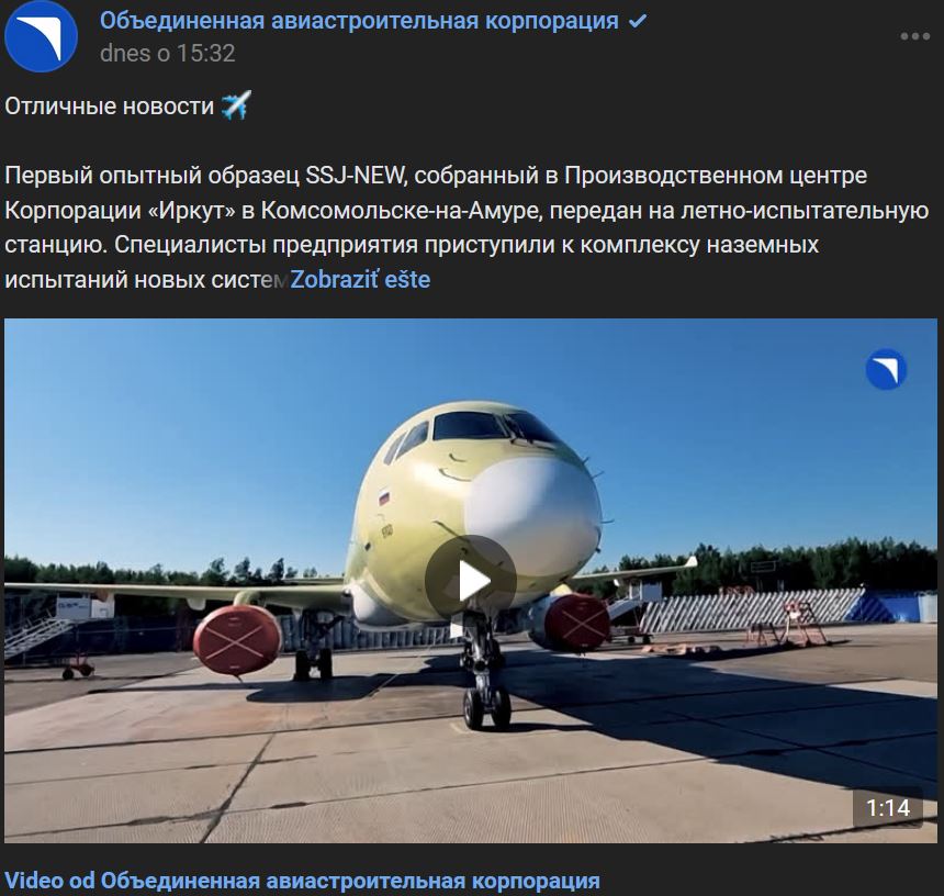 "Vykonanie pozemných skúšok je dôležitým krokom v príprave na prvý let lietadla SSJ-NEW. Počas nasledujúcich týždňov budeme na zemi testovať činnosť všetkých systémov nového lietadla, aby sme sa uistili, že vo vzduchu fungujú správne. Bezpečnosť je jednou z kľúčových priorít pri vývoji novej modifikácie civilného lietadla," povedal Andrej Boginskij (Андрей Богинский), námestník generálneho riaditeľa ОАК pre civilné letectvo a generálny riaditeľ spoločnosti Irkut (Иркут). Video https://vk.com/video-211699782_456239112 dĺžka 1:14 min.