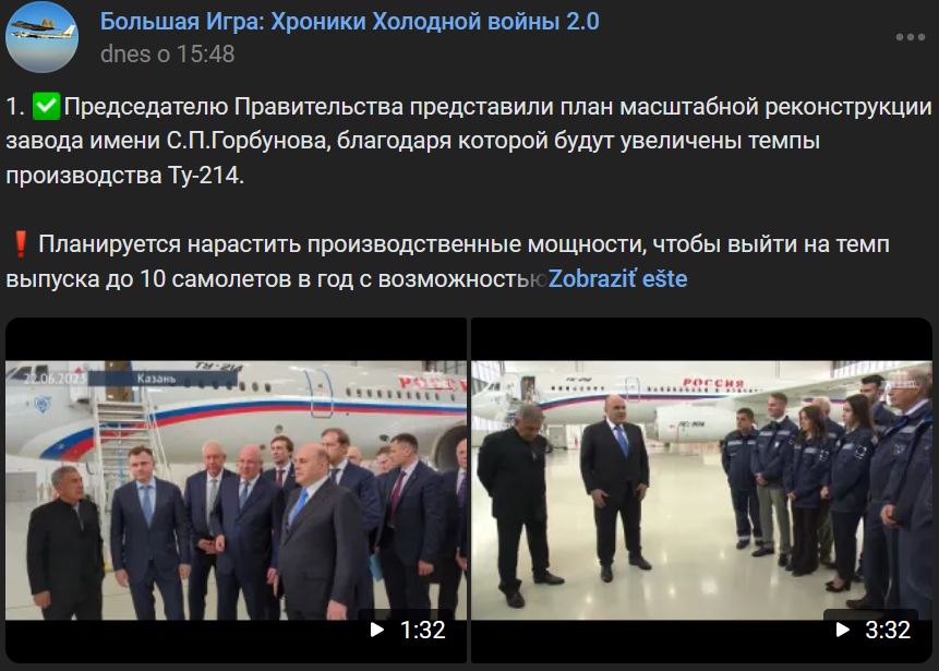 1. Premiérovi RF bol predstavený plán rozsiahlej rekonštrukcie závodu S.P.Gorbunova (С.П.Горбунова), ktorý zvýši tempo výroby lietadiel Tu-214 (Ту-214). Plánuje sa zvýšenie výrobnej kapacity s cieľom dosiahnuť tempo výroby do 10 lietadiel ročne s možnosťou ďalšieho zvýšenia do 20 lietadiel ročne. Rekonštrukcia podniku bude zahŕňať výstavbu novej montážnej haly, uvedenie do prevádzky nového veľkovýrobného zariadenia, modernizáciu existujúcich kapacít, ako aj rekonštrukciu územia podniku. Plánuje sa aj ďalšie vybavenie letovej skúšobnej stanice. Premiér Michail Mišustin (Михаил Мишустин) upozornil na dôležitosť vytvorenia komfortných pracovných podmienok pre zamestnancov závodu, ako aj pre mladých odborníkov, ktorí prichádzajú pracovať do závodu (https://t.me/government_rus/7839).