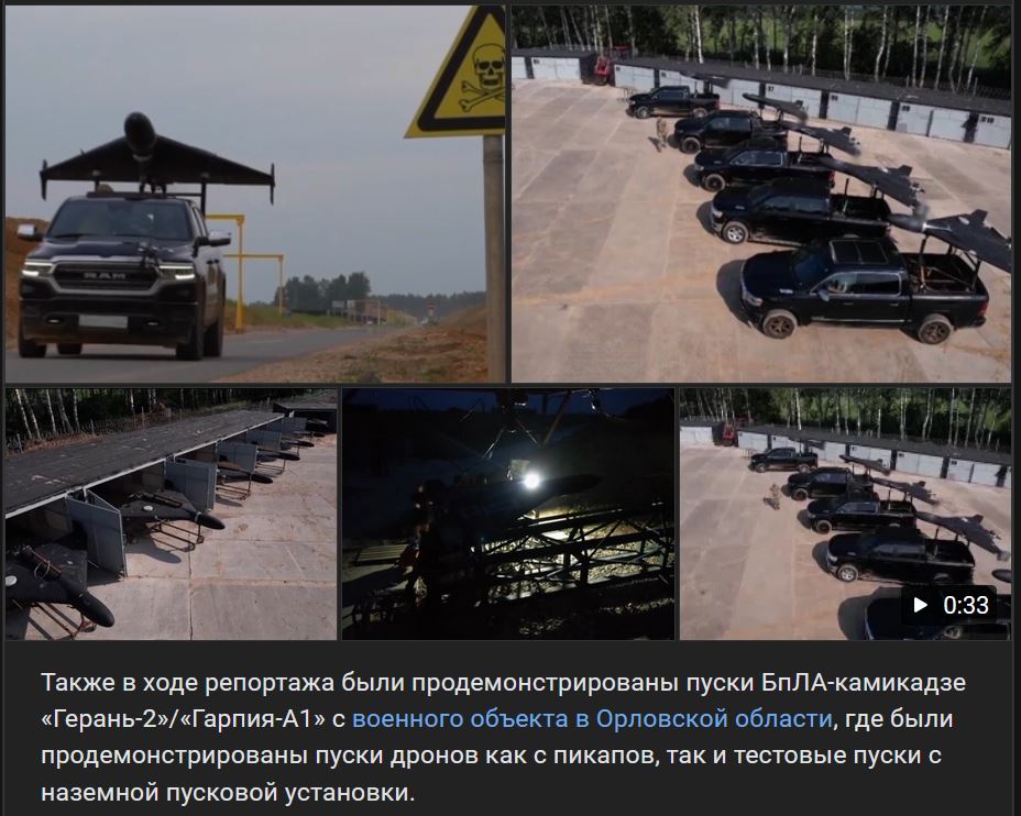 V relácii tiež ukázali štarty BPLA Geraň-2 (Герань-2) / Garpia-A1 (Гарпия-А1) z vojenského zariadenia v Orlovskej oblasti, kde boli demonštrované štarty dronov z pickupov aj skúšobné štarty z pozemného odpaľovacieho zariadenia. Video dĺžka 33 sek.