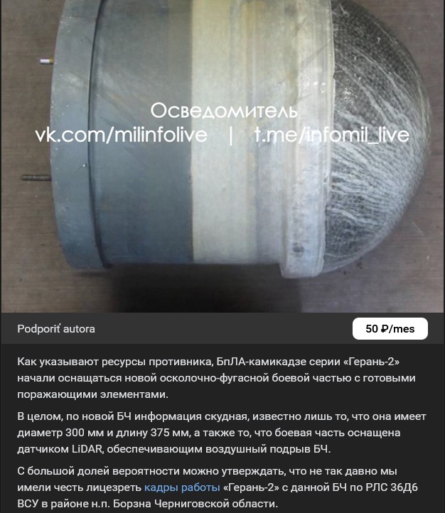 Zdroj https://vk.com/wall-123538639_4711166 z 08.10.2025Ako uvádzajú zdroje nepriateľa, BPLA-kamikadze série „Geraň-2“ (Герань-2) začali byť vybavené novou trieštivo‑trhavou (fragmentačno‑trhavá) bojovou časť s predformovanými (hotovými) účinnými prvkami / fragmentmi / elementami.