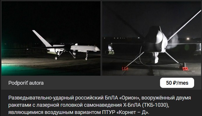 Zdroj https://vk.com/wall-123538639_4743436 z 17.11.2025Prieskumno-bojový ruský BPLA „Orion“ (Орион), vyzbrojený 2 raketami s laserovou navádzacou hlavicou X-BpLA (TKB-1030/ТКБ-1030), ktoré sú vzdušnou verziou protitankovej riadenej strely „Kornet–D“ (Корнет–Д).