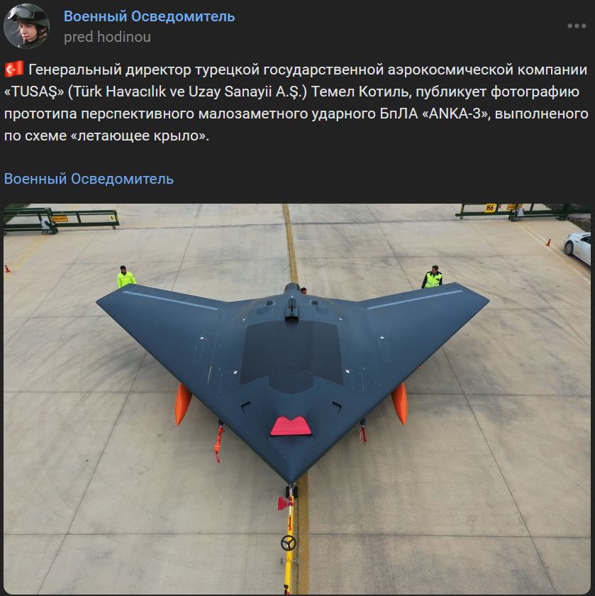 Generálny riaditeľ tureckej štátnej leteckej spoločnosti TUSAŞ (Türk Havacılık ve Uzay Sanayii A.Ş.) Temel Kotil zverejnil fotografiu prototypu pokročilého bojového lietajúceho krídla ANKA-3.