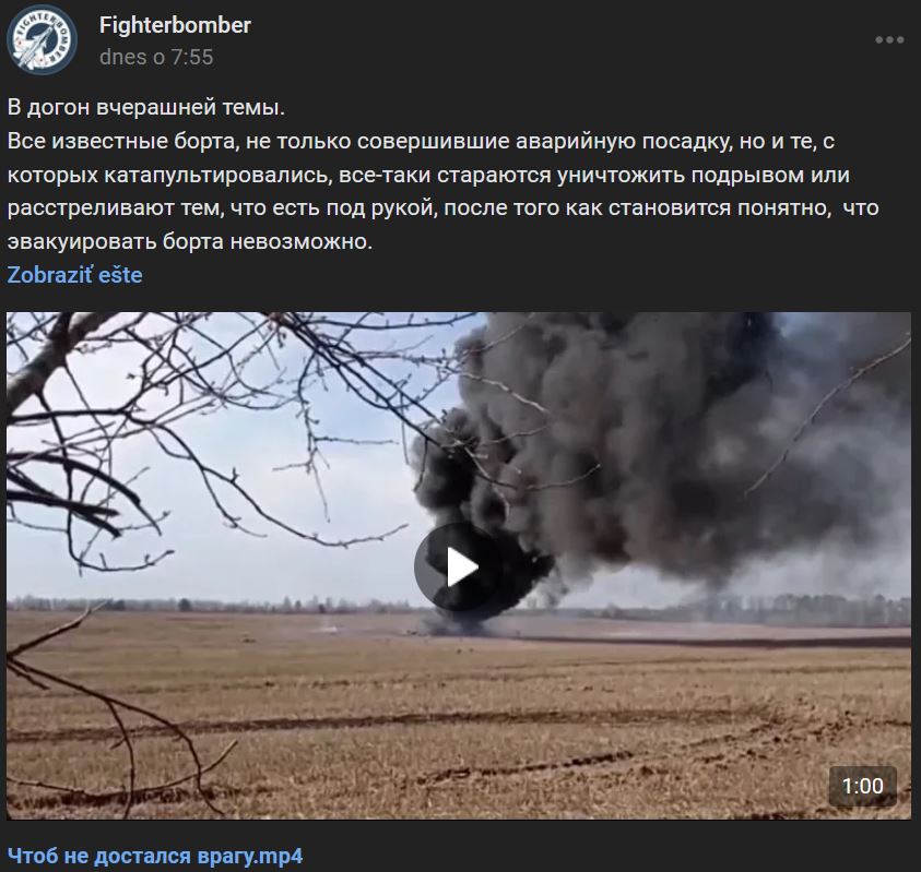 Stroj však zostal na zemi takmer 40 dní, kým sa OS RF nestiahli z Kyjeva, kde ho následne našli ukrajinskí vojaci. Znie to šialene, ale za celý ten čas sa nikto nepokúsil stroj evakuovať alebo aspoň vyhodiť do vzduchu. Vyzerá to obzvlášť komicky, keď nepriateľ odstráňoval hoc aj trosky svojho zničeného moderného vybavenia.