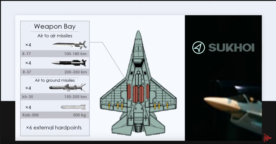 Do vnitřní pumovnice za předpokladu, že má stejné rozměry jako ta na Su-57 (kde jsou ale dvě) se vejde max. PLŘS 6x R-77-1 a nových derivátů rozměrově podobných a po 4x R-37M, jak to? protože nikdo nebude stavět Su-57 pro to, aby mohl nosit celkově interně jen 4x R-77-1 a 2x R-37M. Existují standardní konfigurace výzbroje pro vzdušný boj u těchto váhově rozdílných kategorií letounů (které jsou přímo v zadáních při vývoji) a tohle by bylo fakt žalostně málo jak u Su-57 tak u tohoto stroje.
