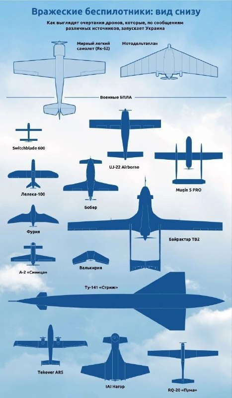 Siluety (pohľad zospodu) dronov a bezpilotných prostriedkov používaných VSU
