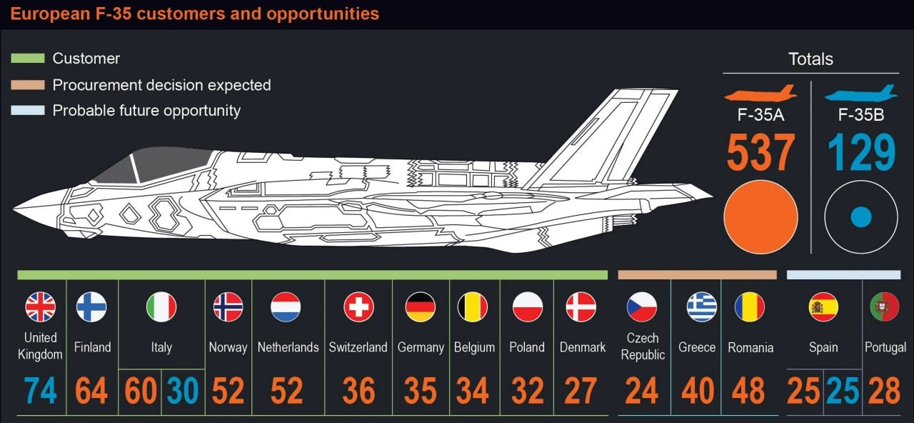 Infografika o predaji lietadiel rodiny F-35 v Európe