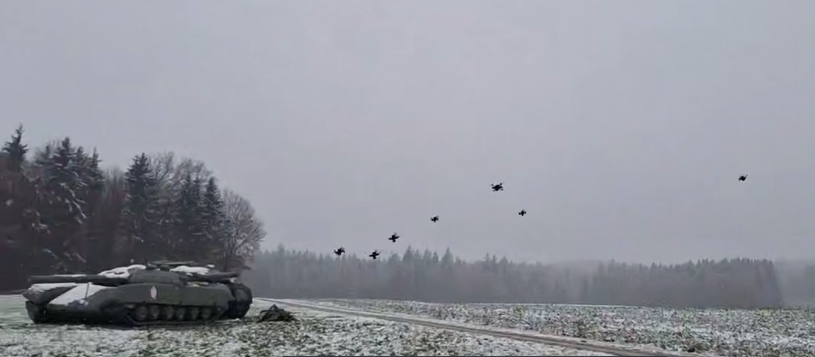 Zábery zo skúšok útoku roja dronov na maketu tanku. Ak vývoj dronov postupuje rýchlym tempom, situácia s prostriedkami ochrany je opačná. Ešte nerealizované guľometné zariadenia s umelou inteligenciou a KAZ s podobnými zariadeniami si s tým neporadia