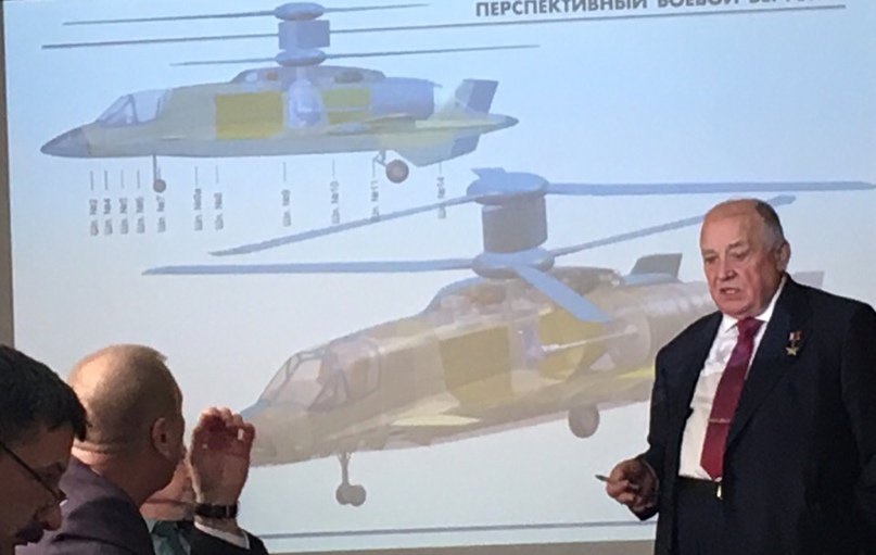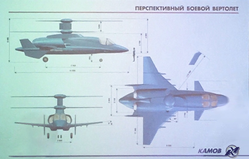 Unik fotek nove vysokorychlostni helikoptery, kterou chce vyvinout Kamov. Delta kridlo, dva nosne rotory a dva tlacne motory na zadi, potlaceni infrastopy, vnitrni pumovnice a dalsi prvky konstrukce zamerene na stealth. Jestli spravne vidim, tak delka cca 14,5m a rozpeti te delty cca 11,5m.Prezentacku mel delat Sergei Mikheyev, hlavni designer Kamova.