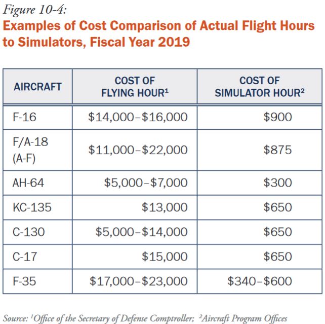 Náklady na 1 letovú hodinu lietadla F-16 sú 14-16 tisíc $, náklady na 1 hodinu letu na letovom simulátore F-16 nepresahujú 900 $. Pre lietadlo F/A-18 sú tieto čísla 11-22 tisíc $ a 875 $. Pre vrtuľník AH-64 = 5-7 tisíc $ a 300 $. Letová hodina tankera KC-135 sa odhaduje na 13 000 $, na simulátore je tréningová hodina 650 $.