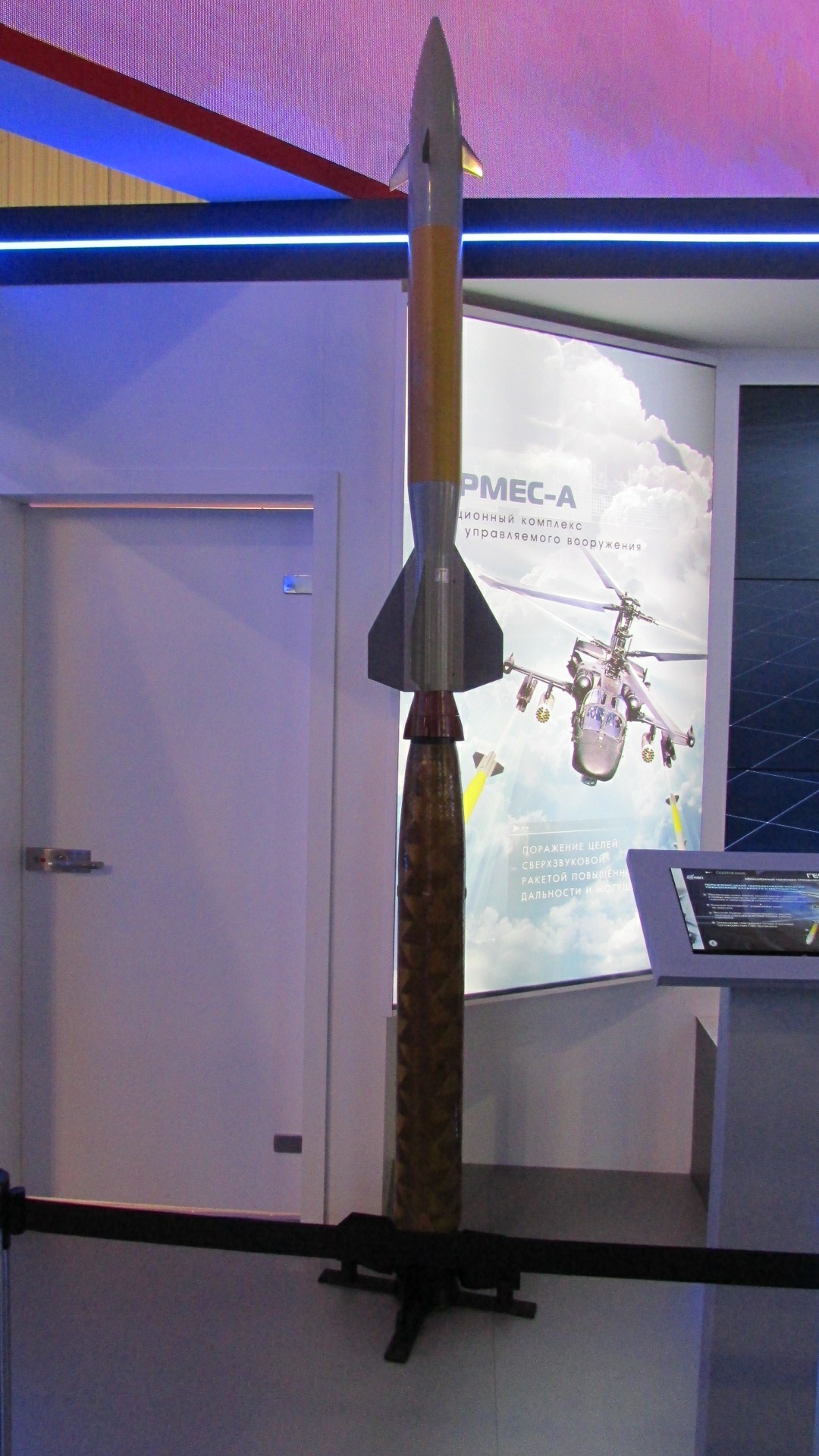 PTŘS Hermes-A/Klevok-A (alias Izd.305) s "šipkou" o hmotnosti 27kg. MAKS-2017 Samozřejmě je tu rozdíl, ale žádný fundamentální, to co ztratí "šipka" PLŘS E7E6 s lepším aerodynamickým profilem na manévrování na dálku 20km pří letu na manévrující vzdušný cíl, tak to má zas "šipka" Hermesu-A v těch +7kg své hmotnosti, kdy letí po poklidné kvazibalistické dráze na pozemní cíl a žádné šílenosti při tom nevyvádí, proto i při použití stejných raketových urychlovačů ty max. dosahy E7E6 a Hermesu-A (původního) jsou identické okolo 20km, tak jako max. rychlosti nejsou zásadně odlišné 1300m/s (M4) vs 1000m/s (M3). Teď u toho nového Hermesu-A (izd. 305) udávají dosah větší než 25km, tedy buď museli "šipku" výrazně odlehčit nebo zeštíhlit (což je dost nemožné vzhledem k typu potřebných boj. hlavic) nebo museli použít větší nový urychlovací blok (průměr 210mm oproti 170mm a +20kg) jak mají ty nové PLŘS E7E6 o dosahu 30km, což s jeví vcelku pravděpodobné.